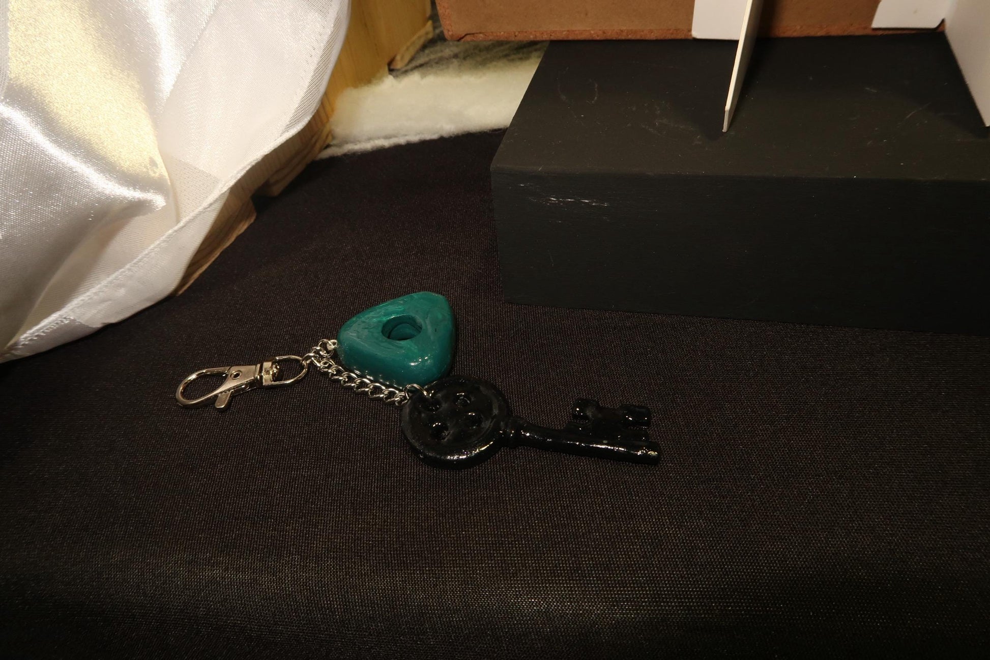100% handmade polymer clay keychain including coraline inspired button key and seeing stone charms